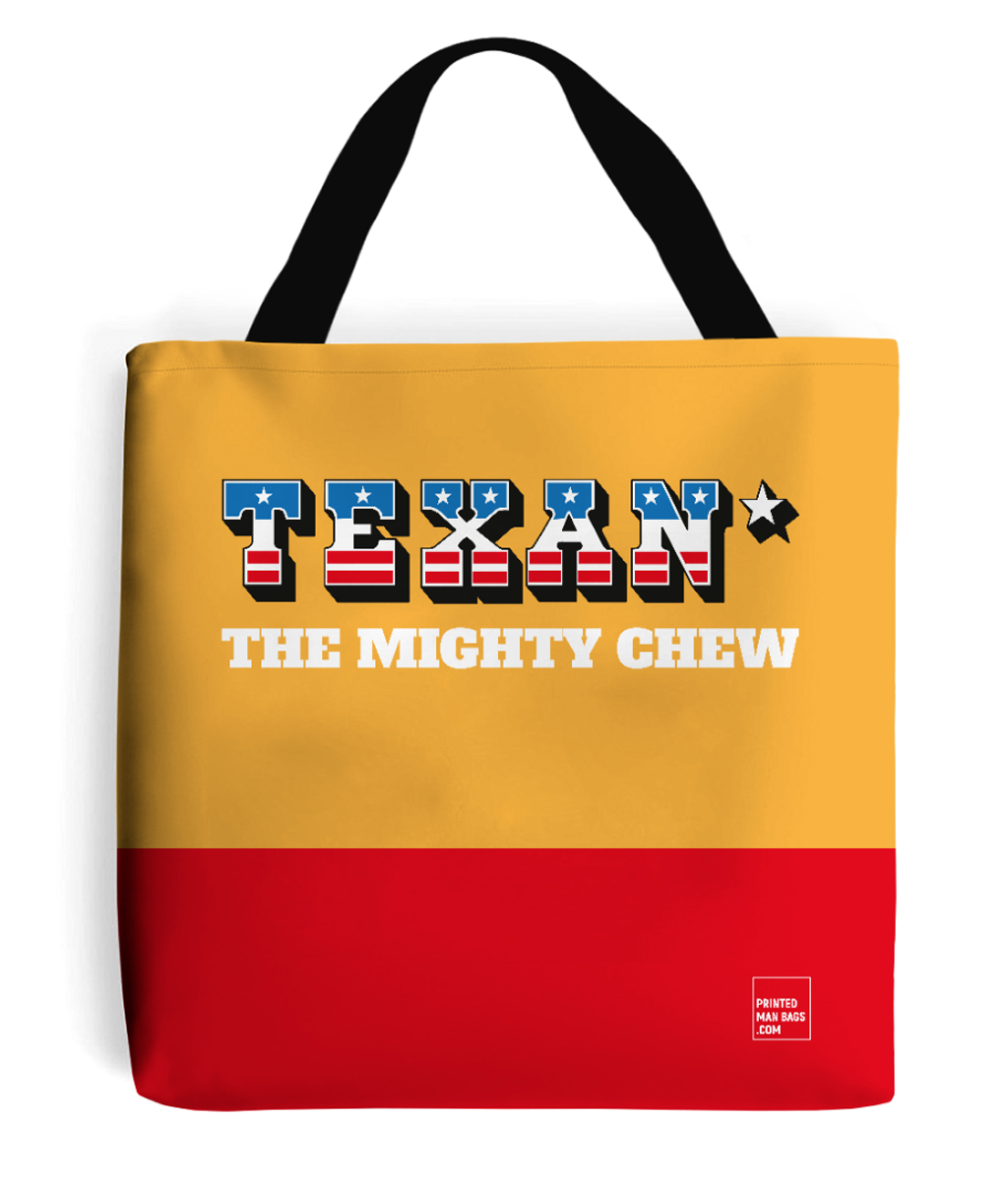 Unlike most other tote bags this printed man bag tote bag is fully manufactured in house at our print facility in the UK. They are printed on a whopping 480gsm 100% polyester material and are approximately 37cm X 41cm. They are manufactured with cotton handles, which are approximately 67cm long.